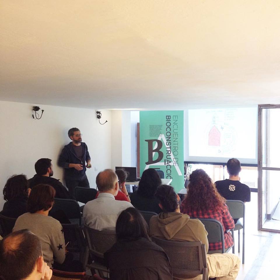 La primera intervención a cargo de Mikel introdujo la bioconstrucción por oposición a un proyecto simulado (falso) que nos relataba la experiencia “bio” de la construcción de “la segunda residencia con estilo nórdico de un monarca árabe en las montañas de atlas bereber, con materiales como barro del delta de un río asiático, maderas tropicales de gran calidad conseguidas a bajo precio, mobiliario de ecodiseño alemán y un sistema domótico de control ambiental que sólo podía ser gestionado por personal especializado”…todo lo que NO es bioconstrucción.