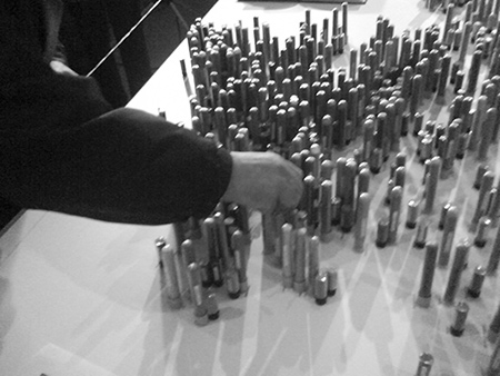 Una vez en Espacio Tangente, una porción de la tierra recogida se introducirá en un pequeño recipiente (vial) para ser pegada en el lugar del mapa correspondiente. El mapa se situará en una sala de Espacio Tangente.