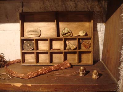 Fósiles de huellas reinventadas conviven con restos en transformación, útiles de vida acabada envueltos en rígidos encajes, naturalezas muertas ahora revividas al aliento y calor de unos labios y pezones de bronce, todos ellos sumergiéndonos en su habitación propia, en este caso tan oscura como resplandeciente por el brillo de los fragmentos de la memoria recuperados y cargados de esencia.