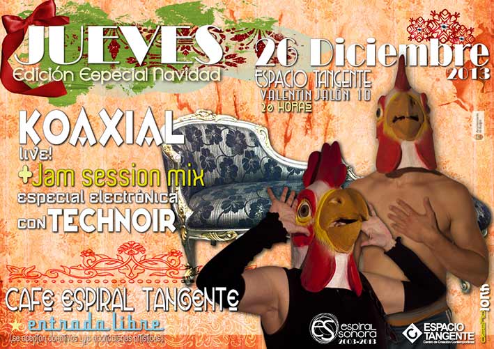 Este año se cumplían 10 años de nuestra trayectoria, y por ese motivo surgió Café Espiral Tangente, en sinergia con el Centro de Creación Contemporánea Espacio Tangente, con el que colaboramos desde nuestros comienzos. En este espacio hemos realizado varias ediciones del Café Espiral Tangente, con una serie de conciertos y jams sessions, donde fusionamos el arte sonoro electrónico con músicos de instrumentos convencionales, junto al arte visual, y otras disciplinas artísticas, como canto, danza, videopoesia, y cualquier disciplina que se prestase a ello….. dentro del concepto de la improvisación y de la experimentación.