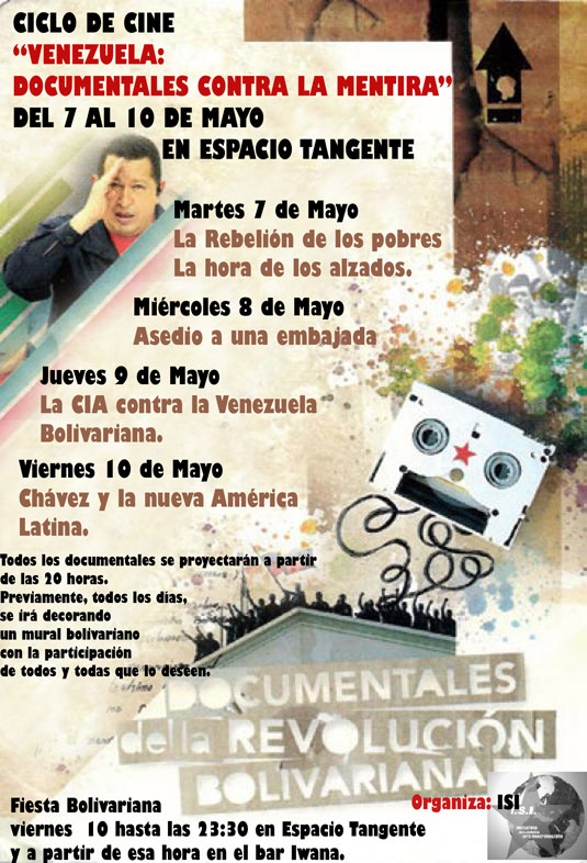 Desde Iniciativa Solidaria Internacionalista de Burgos os animamos a acudir al ciclo de cine que organizamos en Espacio Tangente (C/ Valentín Jalón 10, bajo) la próxima semana, del martes 7 al viernes 10 de mayo 2013, así como a la fiesta que se celebrará en el Bar Iwana el próximo viernes 10 a partir de las 23:30.