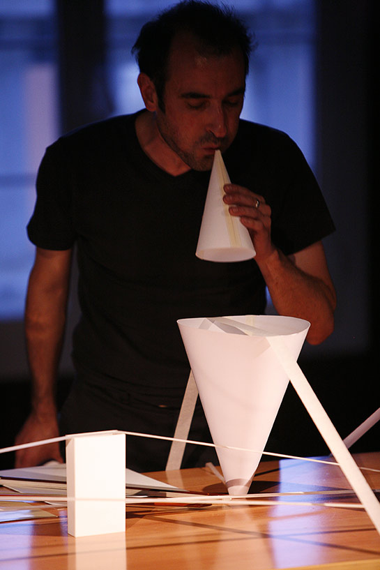 Por supuesto todo ello constituirá una improvisación que puede servirse de otros elementos, asi como de un pasear por entre los oidores y hasta de unas acusmáticas lejanías, si el contexto arquitectónico lo permite."
