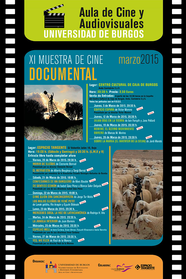 MARZO 2015 Este mes de marzo el Aula de Cine afronta la décimo primera edición de la Muestra de Cine Documental, constituida en esta ocasión por trece largometrajes y un cortometraje, cuyas proyecciones se repartirán, un año más, en dos ubicaciones, todos los jueves del mes en el Salón de Caja Burgos y del 20 al 27 de marzo en Espacio Tangente. La selección de películas que proponemos este año evidencia en su diversidad temática y formal, el carácter complejo que ha adquirido el cine de no ficción, convertido en un auténtico banco de pruebas para la producción audiovisual de nuestros días. Lugar: Espacio Tangente. C/ Valentín Jalón 10, Bajo ORGANIZA: Aula de Cine de la Universidad de Burgos y Espacio Tangente