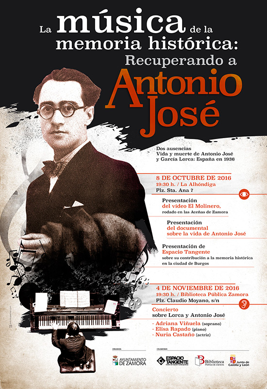 HOMENAJE Participación de Espacio Tangente en Hemos sido invitados e invitadas por parte del Ayuntamiento de Zamora a contar nuestra aportación a la memoria histórica en Burgos y en concreto a la Coordinadora por la Recuperación de la Memoria Histórica de Burgos, que siempre a estado al pie del cañón trabajando por las personas asesinadas y desaparecidas en nuestra provincia. LA MÚSICA DE LA MEMORIA HISTÓRICA: RECUPERANDO A ANTONIO JOSÉ "Durante el mes de cotubre, tendrán lugar en Zamora dos eventos conmemorativos que combinan lo artístico y lo humano, lo tradicional y lo moderno. El objetivo al programarlos es que el conocimiento de la historia nos permita entender mejor el presente y a nosotros mismos. Es difícil encontrar una sola persona en nuestro país que no sepa que en agosto del año 1936, Federico García Lorca fue retenido y ejecutado sin juicio en el entorno de Granada. Sin embargo, no es tan fácil encontrar personas que recuerden que el día 8 de octubre de ese mismo año, sucedió exactamente lo mismo con un compositor de Burgos llamado Antonio José Martínez Palacios. Y no se recuerda porque la campaña de difamación y de entierro de la música de este compositor prosperó durante los años de la dictadura, a diferencia de lo que pasó con Lorca, cuya memoria se conservó muy viva al convertirse en el icono, la referencia cultural absoluta de la izquierda exiliada. Hubo que esperar a la democracia para que se comenzase a hablar de la obra de este músico tan extraordinario, un caso peculiar dentro de su generación (la del 27), pues mientras sus compañeros generacionales solamente escribían música neoclásica o de vanguardia, él se obstinó en seguir combinando temas populares del folklore de su país con el desarrollo de su propio lenguaje musical. Los vínculos de Antonio José con Zamora son importantes, tanto a través de los temas musicales populares (que no conocen fronteras) como por los estrenos de su música que se hicieron en la ciudad y despertaron la curiosidad y el entusiasmo de todos los zamoranos. 80 años después no es posible reparar la vida de las personas que perdimos entonces. Sin embargo, si retomamos su legado, podría no ser tarde para recuperar su voz: el próximo sábado 8 de octubre a las 19.30 horas tendrá lugar en La Alhóndiga el primer evento enmarcado en el proyecto denominado La música de la memoria histórica. Será una charla de presentación del videoclip El Molinero, rodado en las Aceñas de Zamora. |