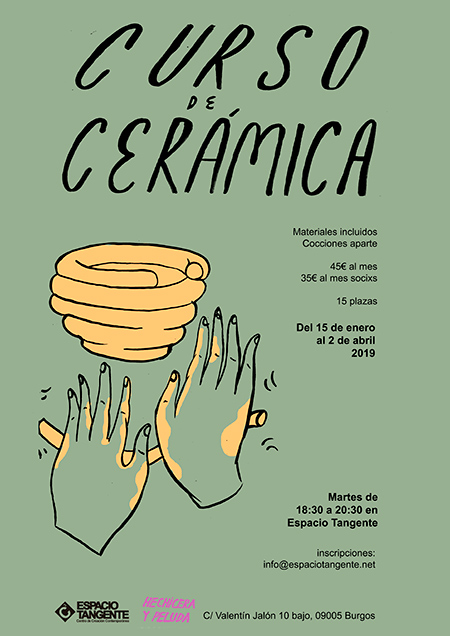 CURSO DE CERÁMICA En este taller aprenderemos las características principales de la cerámica. Se darán a conocer desde conceptos básicos como la preparación de la arcilla y su tratamiento hasta diversas técnicas de modelado y moldes. Condiciones: >Más info sobre contenidos del taller: hechiceraypeluda@gmail.com