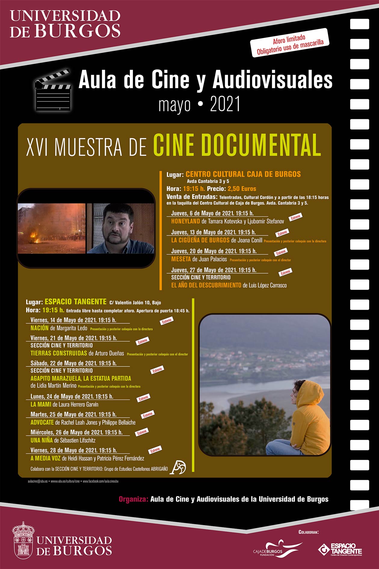 JUEVES 13 DE MAYO 2021 // 19.15H JUEVES 20 DE MAYO 2021 // 19.15H JUEVES 27 DE MAYO 2021 // 19.15H Colabora con la SECCIÓN CINE Y TERRITORIO: Grupo de Estudios Castellanos ABRIGAÑO AFORO LIMITADO TODA LA INFO SOBRE LAS PROYECCIONES EN CULTURAL CAJA DE BURGOS AQUÍ Colabora con la SECCIÓN CINE Y TERRITORIO: Grupo de Estudios Castellanos ABRIGAÑO VIERNES 28 DE MAYO // 19.15h Lugar: Espacio Tangente. C/ Valentín Jalón 10, Bajo