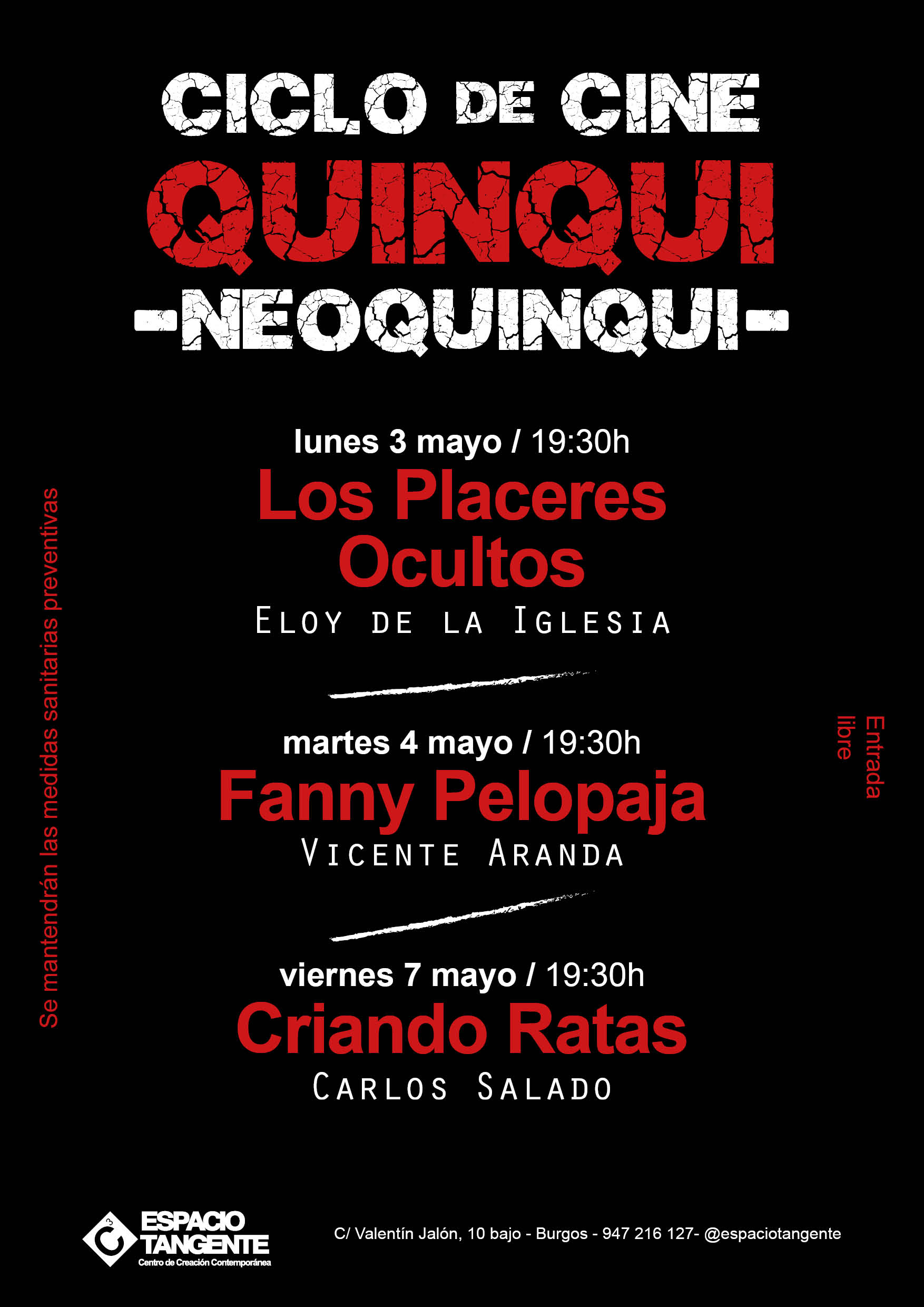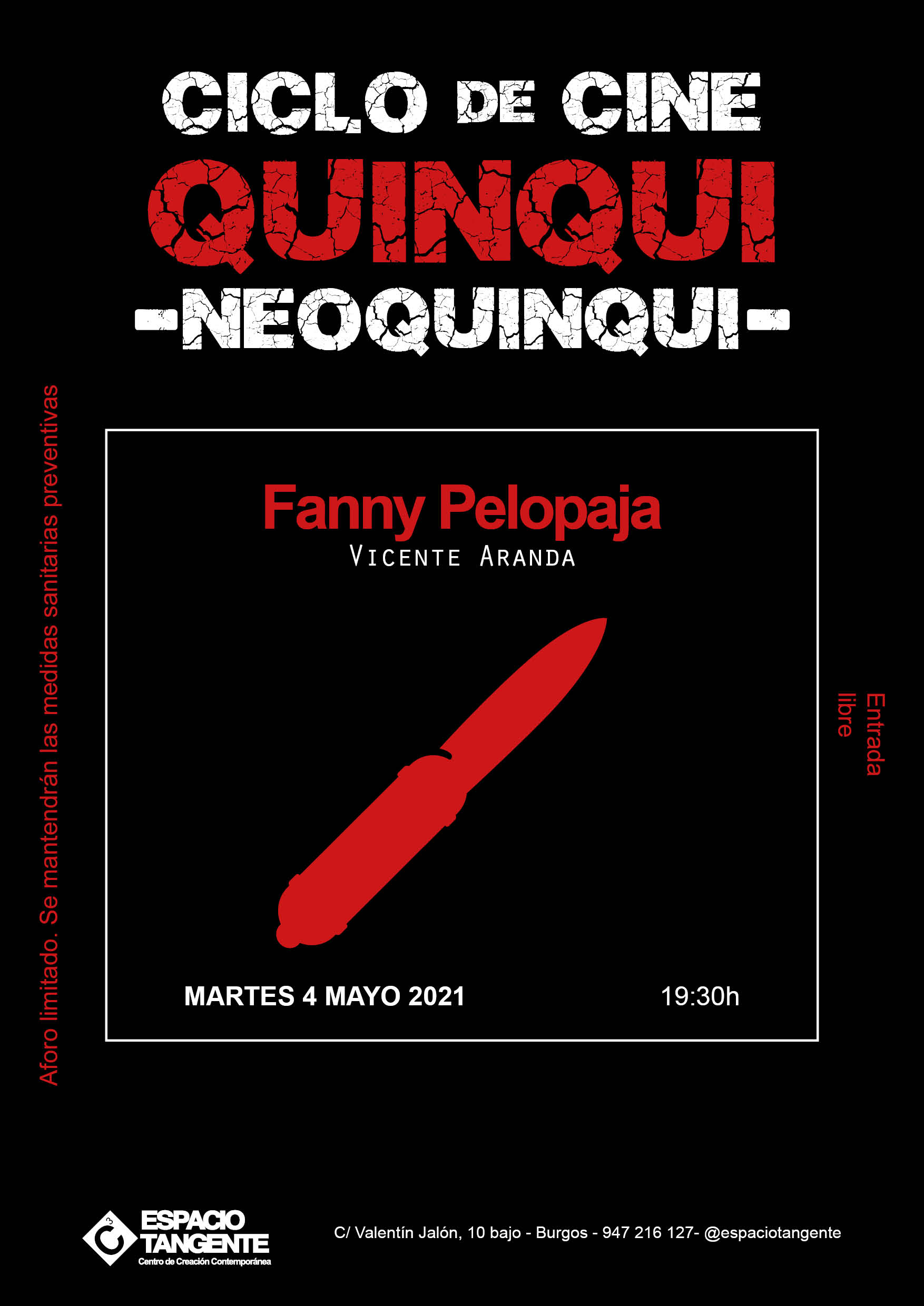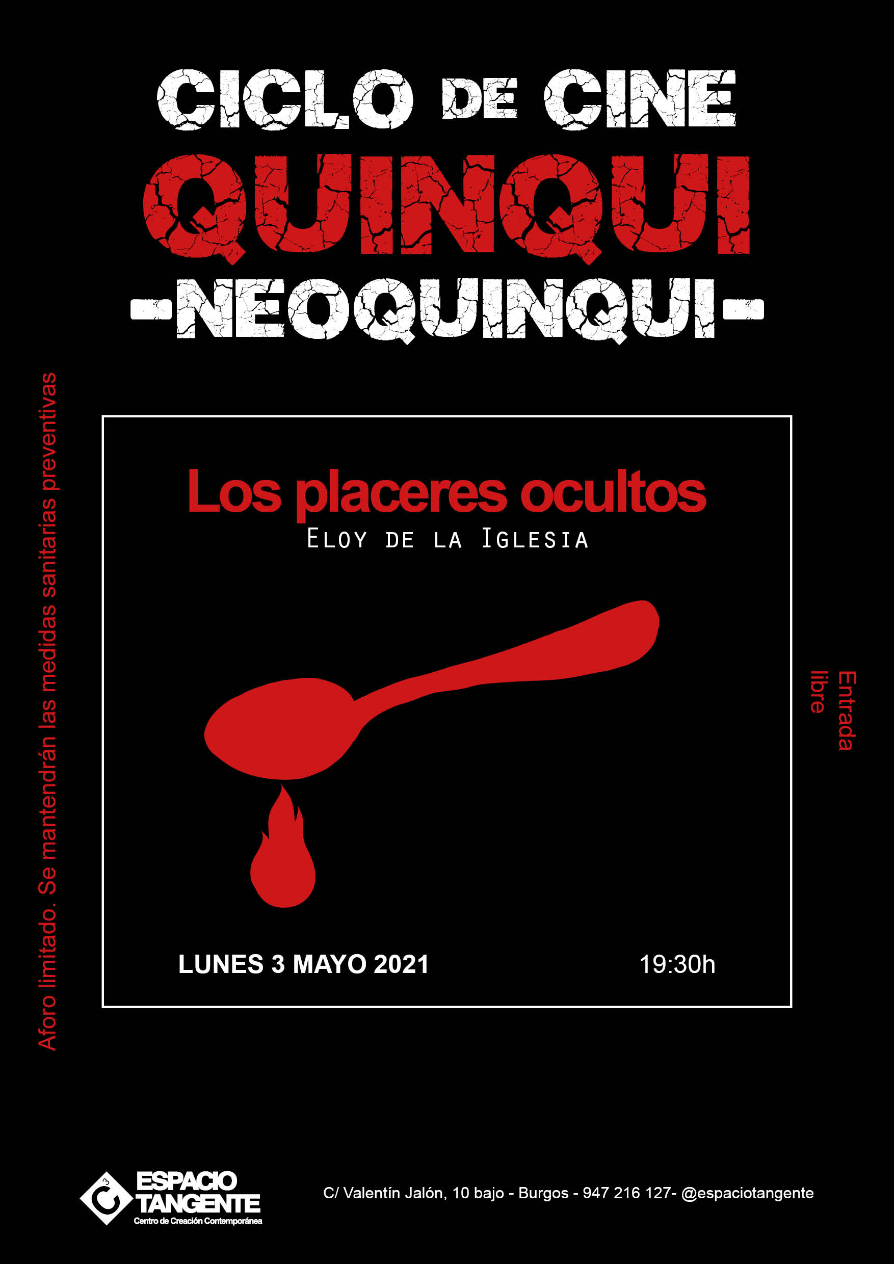 3 - 4 - 7 DE MAYO 2021 Un ciclo que inlcuye la proyección de 3 películas: 2 pertenecientes al género quinqui y una al denominado neoquinqui. Así se puede comprpbar cómo ha ido evolucionando el género quinqui, desde finales de los 70, cuando surgió el género; hasta la actualidad. Entrada libre hasta completar aforo. Apertura de puerta 19 h |