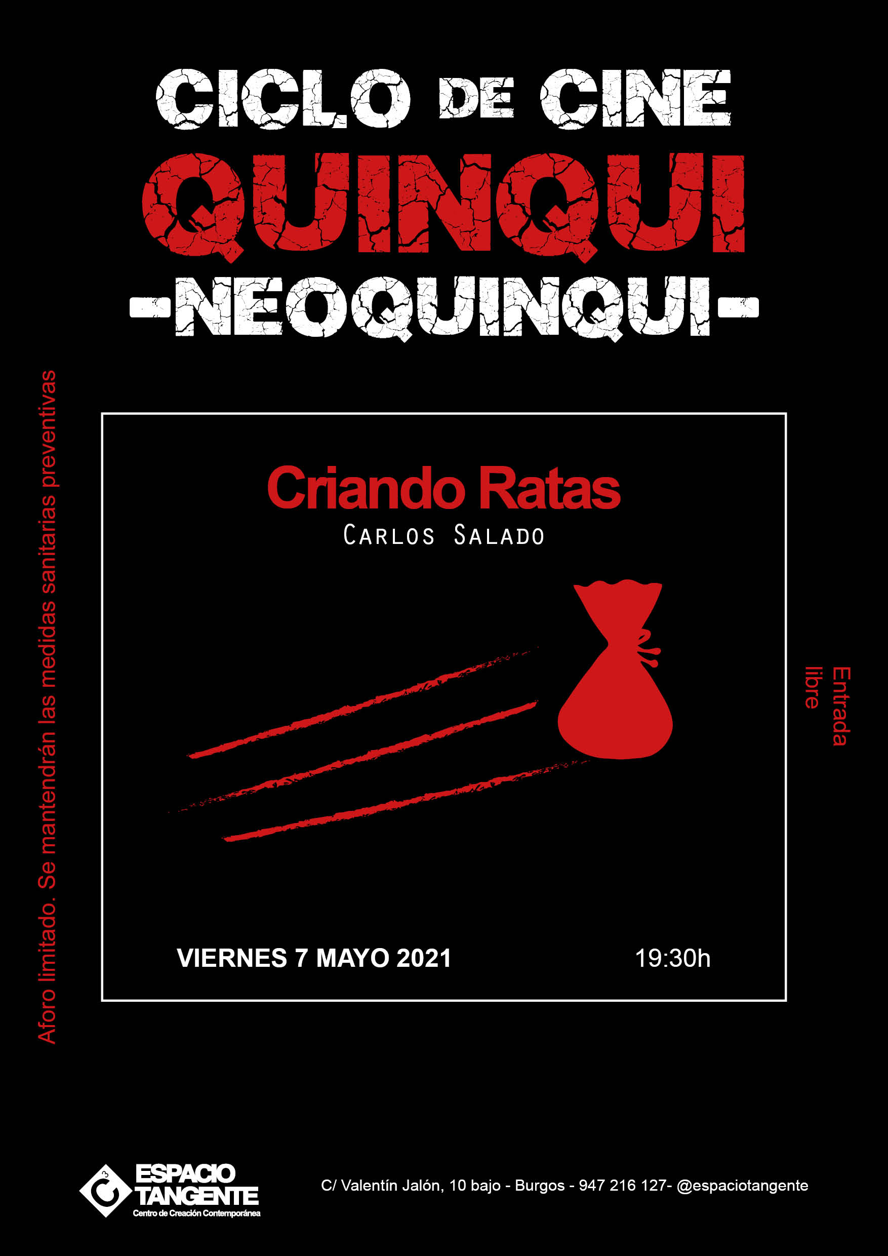 Viernes 7 de mayo / 19,30 h Criando Ratas de Carlos Salado Se trata de la primera película considerada como género neoquinqui. Es del director novel Carlos Salado y se publicó directamente en la plataforma Youtube. Totalmente necesaria para conocer la nueva forma de este género. ” El Cristo", reputado delincuente juvenil, tiene una deuda con uno de los narcotraficantes más poderosos de su barrio. Bajo los efectos del consumo de sustancias estupefacientes e inmerso en un estado de desesperación, lleva a cabo todo tipo de actos delictivos para conseguir el dinero. Poco a poco, irá cometiendo errores que le harán ganarse muchos enemigos. Paralelamente, muestra las aventuras y desventuras de tres chavales que están comenzando su carrera delictiva. Juntos sufrirán las consecuencias de su estilo de vida y comprenderán cuál es el precio a pagar.” (FILMAFFINITY) Año: 2017 Director: Carlos Salado |