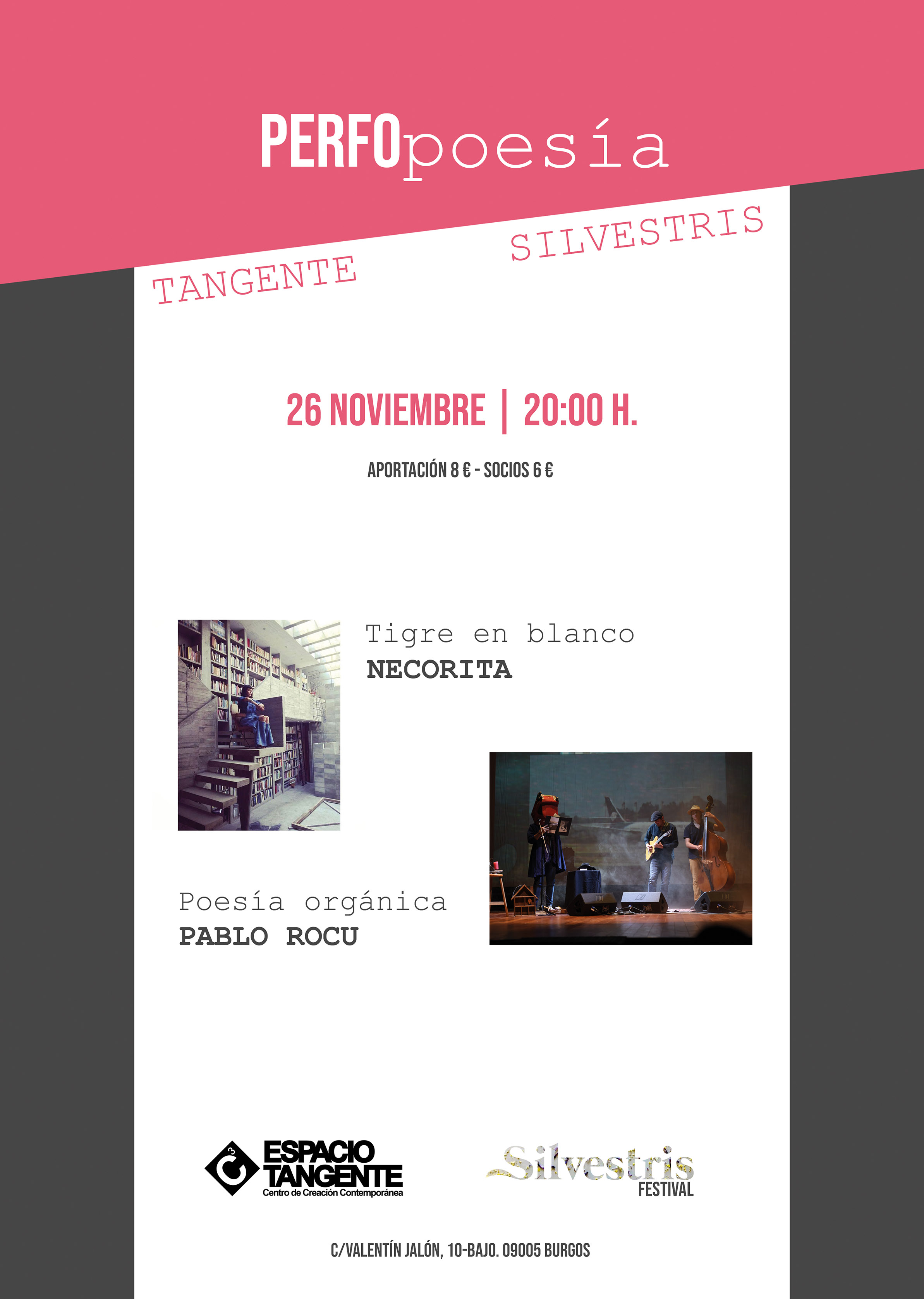Espacio Tangente inicia una nueva colaboración con el Silvestris Festival, un festival dedicado a la música, la poesía y la perfopoesía que desarrolló su primera edición el pasado septiembre en la Ermita de Valpeñoso (Burgos) En esta primera colaboración donde se unirá la poesía, la performance y la música, vendrá desde México, Necorita con la presentación de su libro de Poesía visual y lengua muerta TIGRE EN BLANCO y Pablo Rocu desde Andorra (Teruel) con Poesía orgánica.