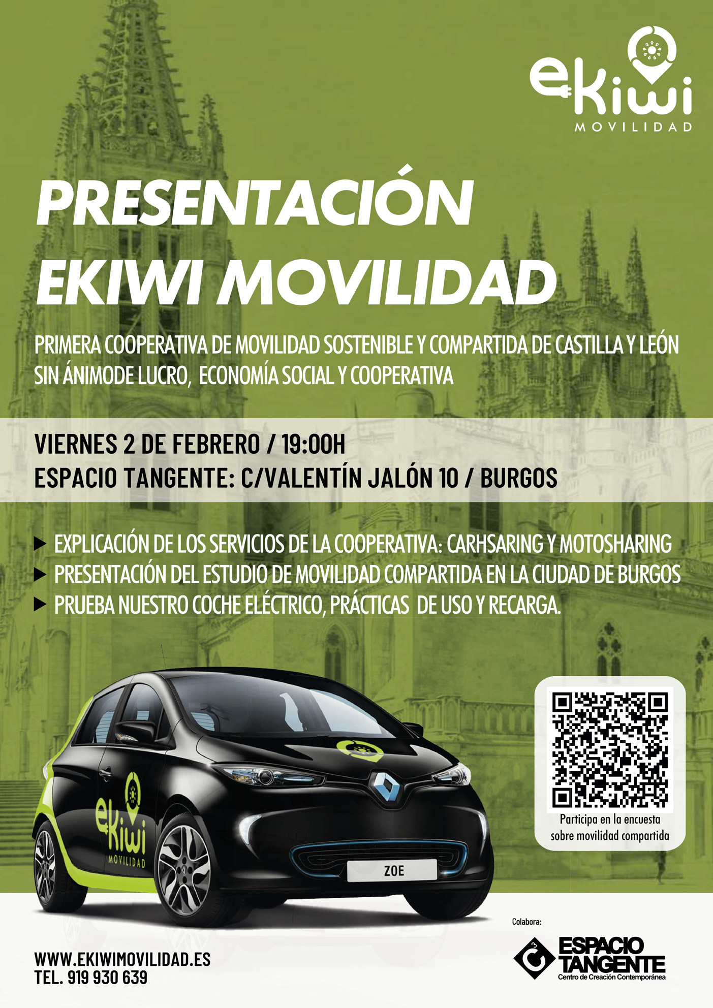 VIERNES 2 DE FEBRERO 2024 Presentación de Primera cooperativa de movilidad sostenible y compartida de Castilla y León son ánimo de lucro, economía social y cooperativa. - Explicación de los servicios de la cooperativa: carsharing y motossharing EKIWI SOSTENIBILIDAD VALORES